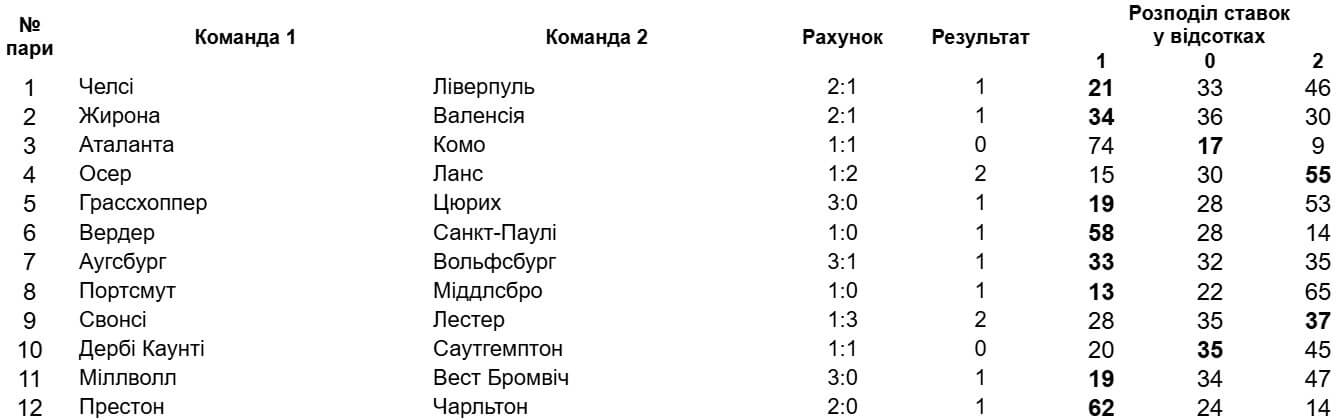 Головну сенсацію також зафіксовано в Англії - це поразка "Міддлсбро" на полі "Портсмута" (13%). Крім цього, "Міллволл" не залишив шансів "Вест Бромвічу", а "Грассхоппер" у дербі познущався над "Цюрихом" (по 19%). "Аталанта" і "Комо" обмінялися голами на початку матчу і на цьому вирішили зупинитися (17%).