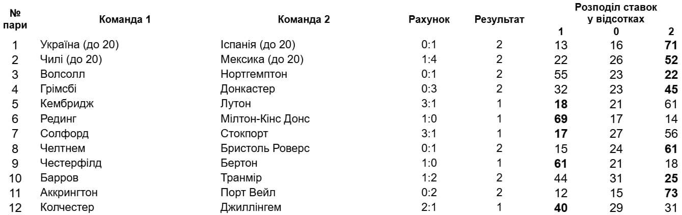З іншого боку, маємо 5 результатів із показником "угадуваності" понад 60%. Але прогнозистам це особливо не допомогло, і тільки один із них виграв 5082 грн за 11 вгаданих результатів. Також маємо 12 "десяток" - по 529 грн кожну.
