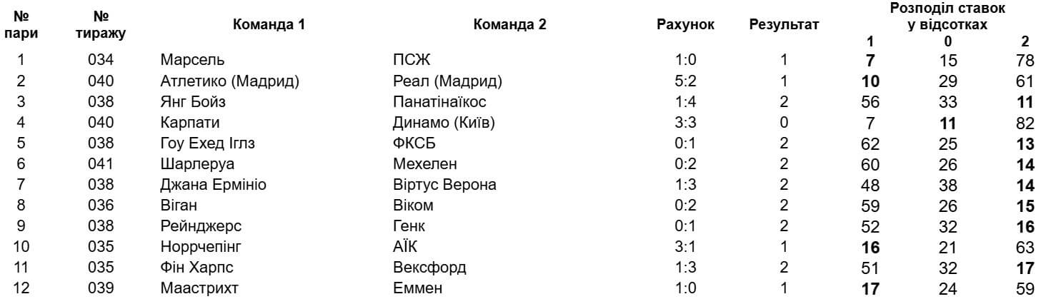 Ще один "спортпрогнозівський" тиждень обійшовся без зірваних джекпотів, а найгучніша сенсація належить до 034 тиражу. Його розіграш мав відбутися у неділю, 21 вересня, однак через негоду матч "Марсель" - "ПСЖ" перенесли на понеділок.