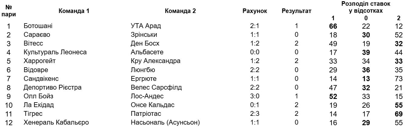 Цього виявилося достатньо, аби позбавити шансів усіх претендентів на джекпот. Учасникам не допомогли чотири результати з показником "угадуваності" понад 50%, а шестеро прогнозистів, що вгадали "десятку", виграли по 766 грн.