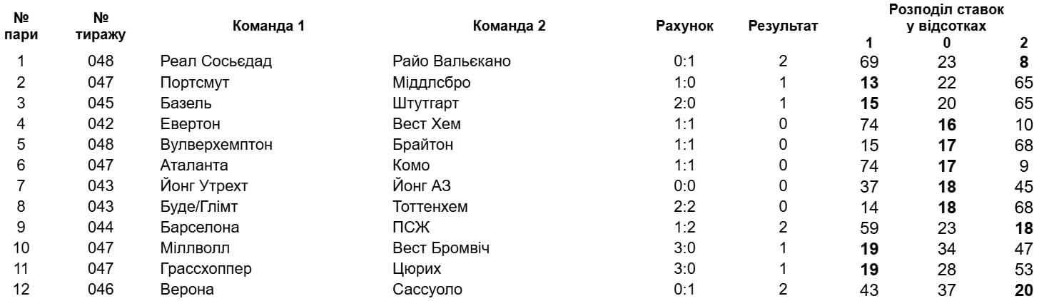 Днем раніше головну сенсацію було зафіксовано в Англії - це поразка "Міддлсбро" на полі "Портсмута" (13%). Крім цього, "Міллволл" не залишив шансів "Вест Бромвічу", а "Грассхоппер" у дербі познущався над "Цюрихом" (по 19%). "Аталанта" і "Комо" обмінялися голами на початку матчу і на цьому вирішили зупинитися (17%).