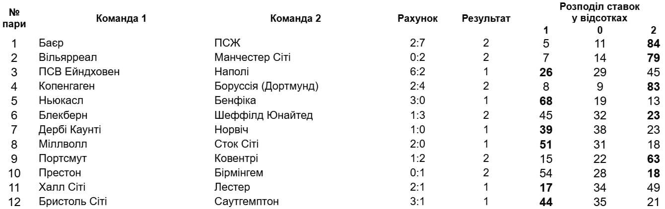 Система містила в собі однозначні перемоги "ПСЖ", "Манчестер Сіті", "Боруссії" та "Ньюкасла", а в інших матчах переможець використав подвійні варіанти. Цікаво, що в семи поєдинках не були передбачені нічийні результати, і тільки в дев'ятій парі наш герой абсолютно не вірив у перемогу "Портсмута".