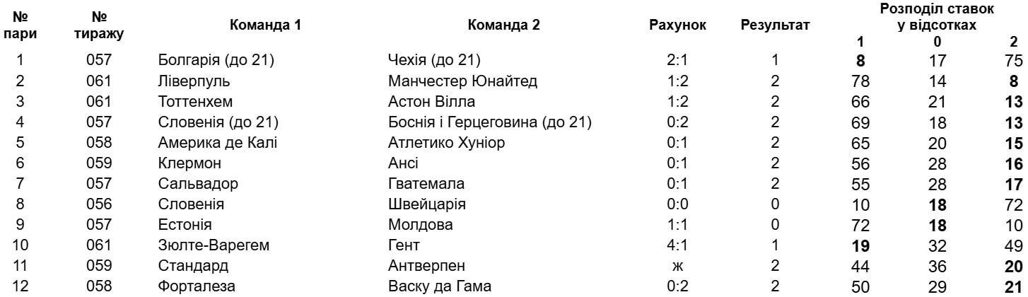 Також відзначаємо інші несподіванки 057 тиражу: гостьову перемогу молодіжної збірної Боснії і Герцеговини (13%), гостьовий успіх Гватемали (17%), а також нічию між Естонією та Молдовою (18%).